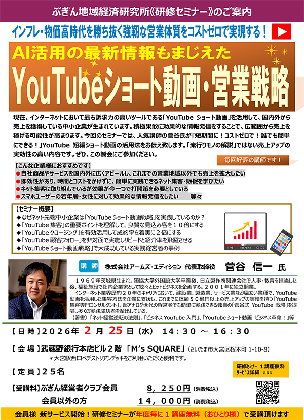 埼玉県・さいたま市・ぶぎん地域経済研究所で講演・セミナー講師「AI活用の最新情報もまじえたYouTubeショート動画・営業戦略」【388本】2026年2月25日菅谷信一の全国講演行脚日記 埼玉県さいたま市のぶぎん地域経済研究所で講演・セミナー講師「AI活用の最新情報もまじえたYouTubeショート動画・営業戦略」